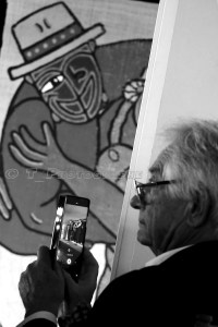 1. Le propriétaire des lieus, le décor récurrent (toile achetée par l’association à une artiste en résidence lors d’une précédente édition du festival) et le clin d’oeil du danseur, les artistes capturés dans le téléphone portable… oui, LA photo de ce concert 😉