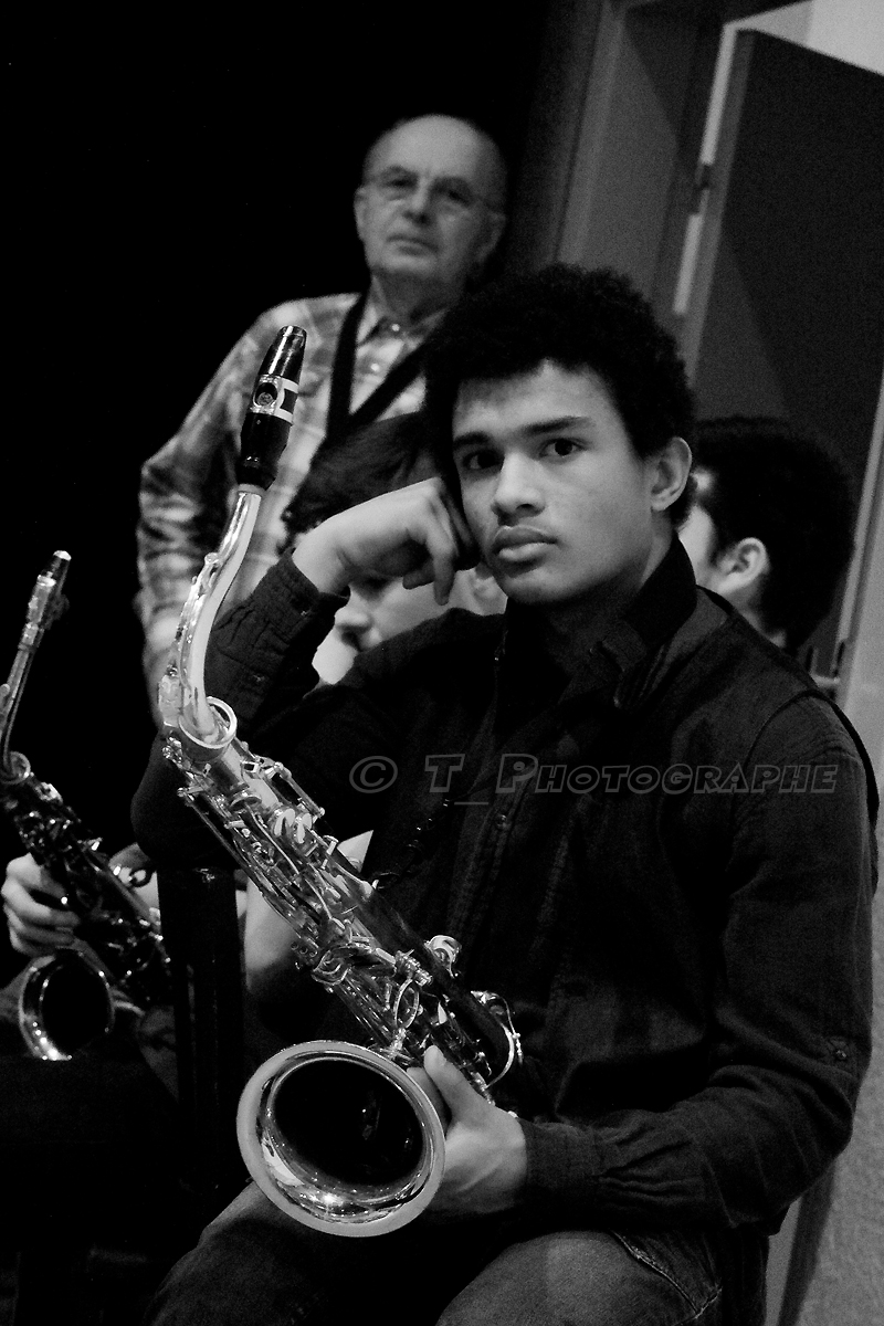 La photographie est une question d’équilibre. Cadré avec trop de rectitude, cet instant eût été trop figé. Le basculement vers la droite des deux personnages est compensé par l’inclinaison inverse des deux instruments, question de rythme des formes… Deux instruments, deux personnages, deux âges… Question de rythme encore… Là, pas de micros devant la figure, pas de grimaces ;-), simplement l’insondable regard d’un jeune musicien qui laisse place à toutes les interrogations… L’atmosphère du jazz n’est pas toujours sur scène : pour moi, cette photographie est un sublime instant de jazz.